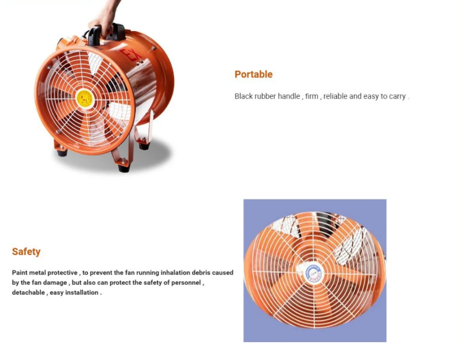 CTF Portable axial fan suction strong , light and practical , easy to move , novel and beautiful style . The axial fan easily connected with the telescopic air pipe , which can easily pump gas and dust to other places and ventilate the closed space . It is the most suitable spceial fan for shipbuilding , machinery , chemical industry , engineering and other occasions .