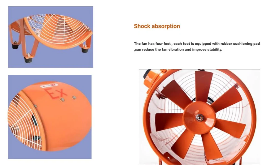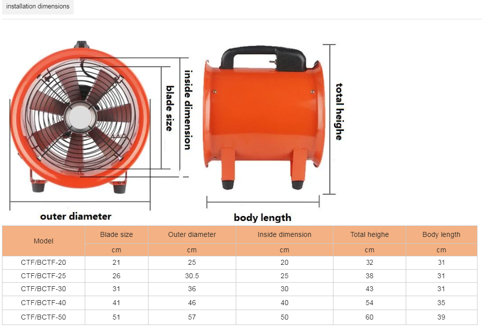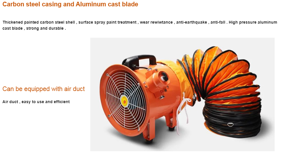 CTF Portable axial fan suction strong , light and practical , easy to move , novel and beautiful style . The axial fan easily connected with the telescopic air pipe , which can easily pump gas and dust to other places and ventilate the closed space . It is the most suitable spceial fan for shipbuilding , machinery , chemical industry , engineering and other occasions .