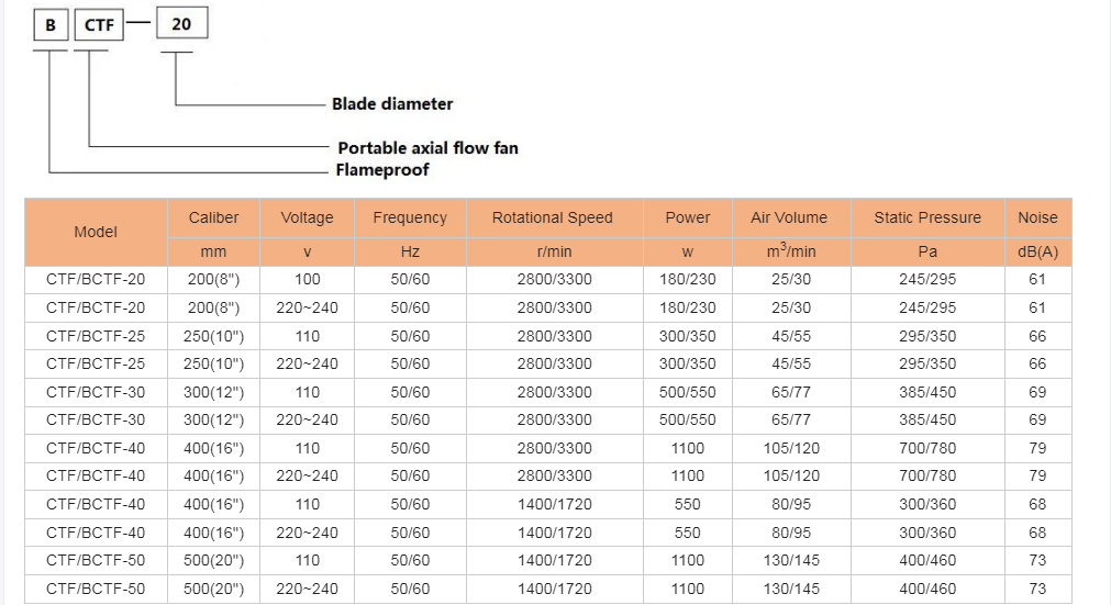 BCTF Portable explosion-proof axial fan not only has the above characteristics , but also has large air volume , small noise , reliable structure , durable , high insulation performance , high etmperature and high pressure resistance . It is widely used in the use of bad air environment and the exhaust gas pumping of closed narrow space construction , such as basement , tunnel , municipal pipeline engineering , mechanical shipbuilding engineering , mining ventilation , fire smoke exhaust , welding operations , etc .